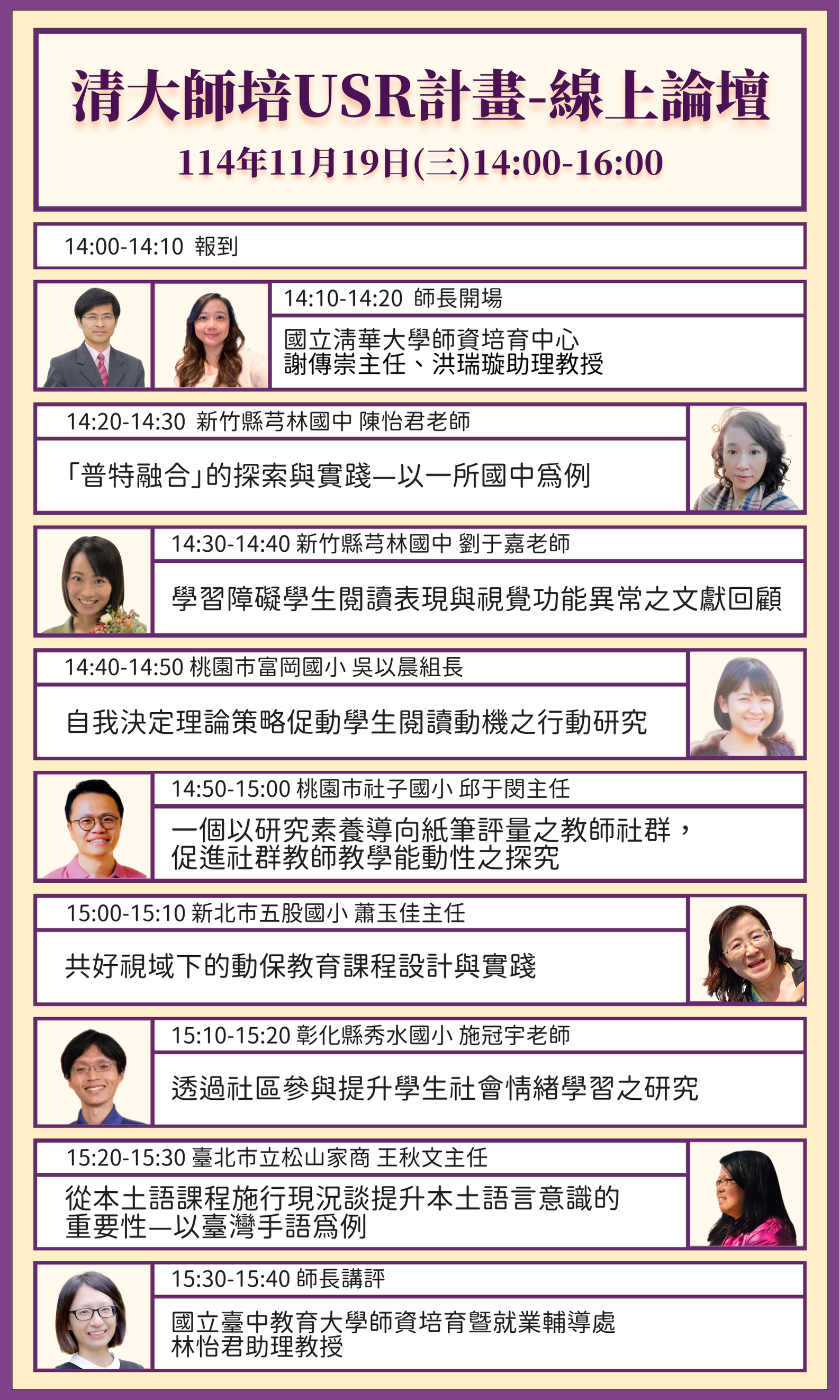 | 二、 | 為推廣該校USR計畫之研究成果,爰辦理線上論壇,邀請參與計畫教師分享教學實踐與行動研究經驗,以促進跨域交流與專業對話。 |