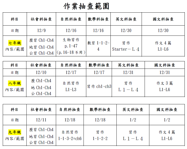 各年級作業抽查範圍及日期如下。相關實施辦法如附件。(將於近日同步紙本公告各班)