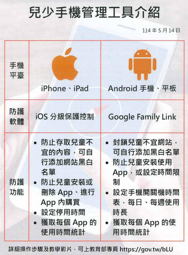 (一)本部已建置免費「數位工具包」資源,提供圖解操作手 冊與教學影片,協助家長設定子女手機使用時間、過濾 暴力與色情等不當內容等功能,相關資源連結: https://gov.tw/bLU。倘家長無法自行完成安裝,亦可至三大電信業者指定之直營門市,經簽署同意書後,由門市人員現場協助其自 行安裝或設定該功能並指導使用。