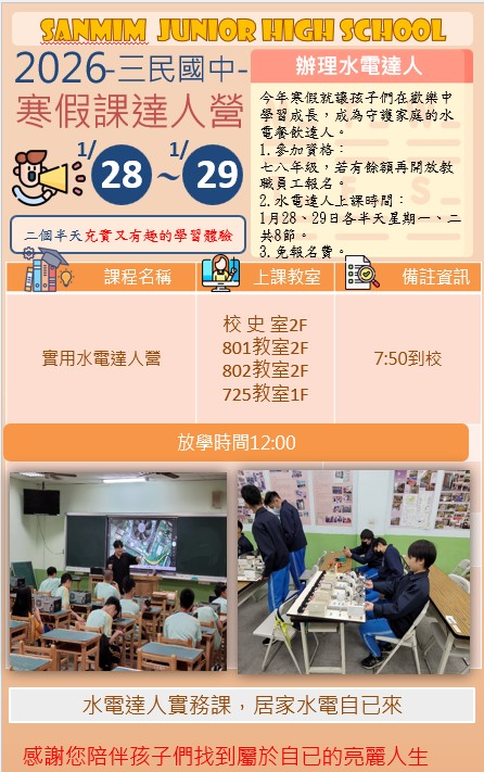 親愛的家長您好:寒假「水電達人營」報名作業已於今日截止,經審核後錄取名單已公告。請家長協助提醒錄取學生依相關通知準時參加,謝謝您的配合與支持。