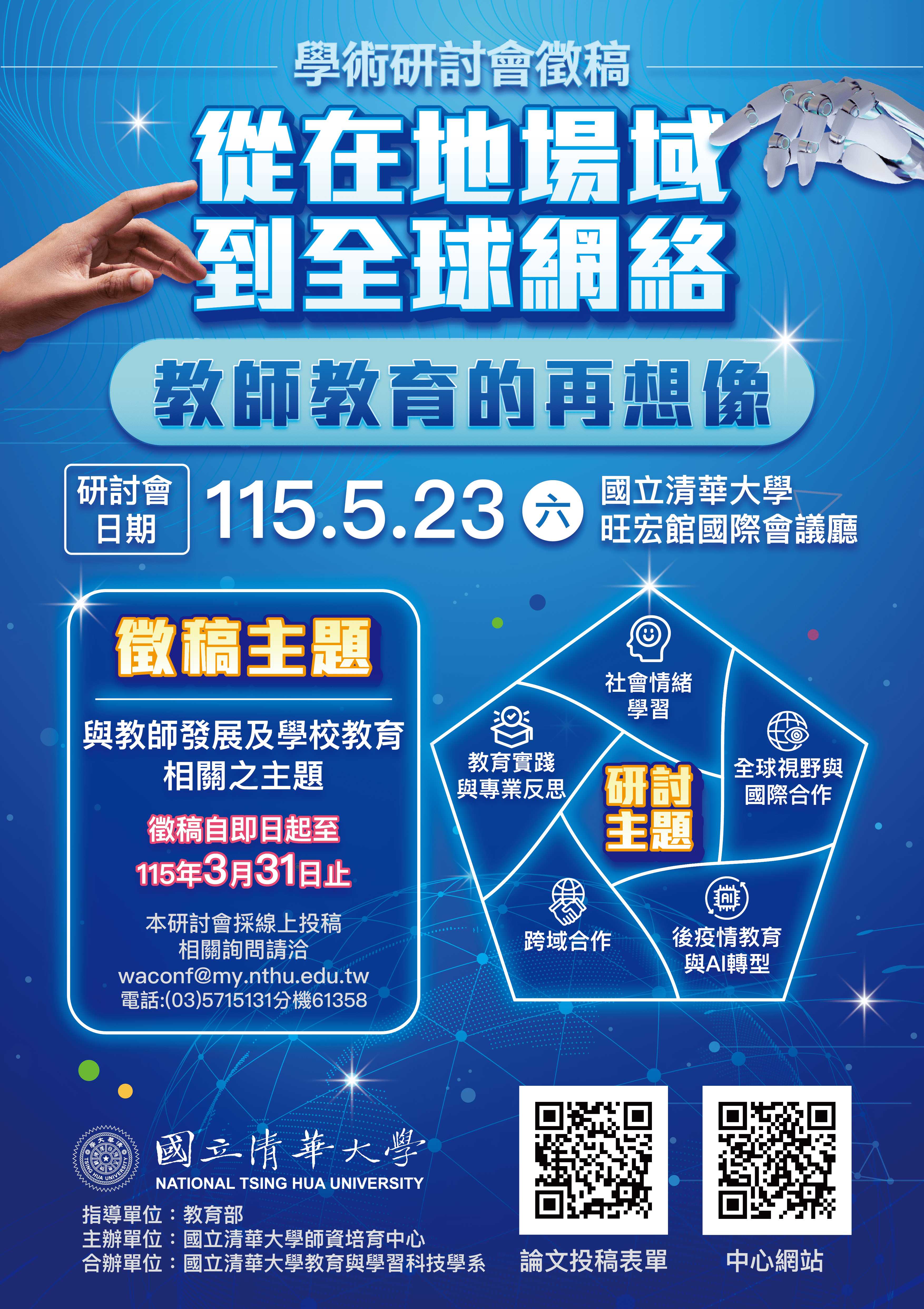 | (三) | 研討議題包含但不限於:教育實踐與教師專業反思、社會情緒學習(SEL)融入實踐、後疫情及人工智慧(AI)脈絡下的師資培育、跨域合作實踐,以及全球視野與國際合作等相關議題。 |