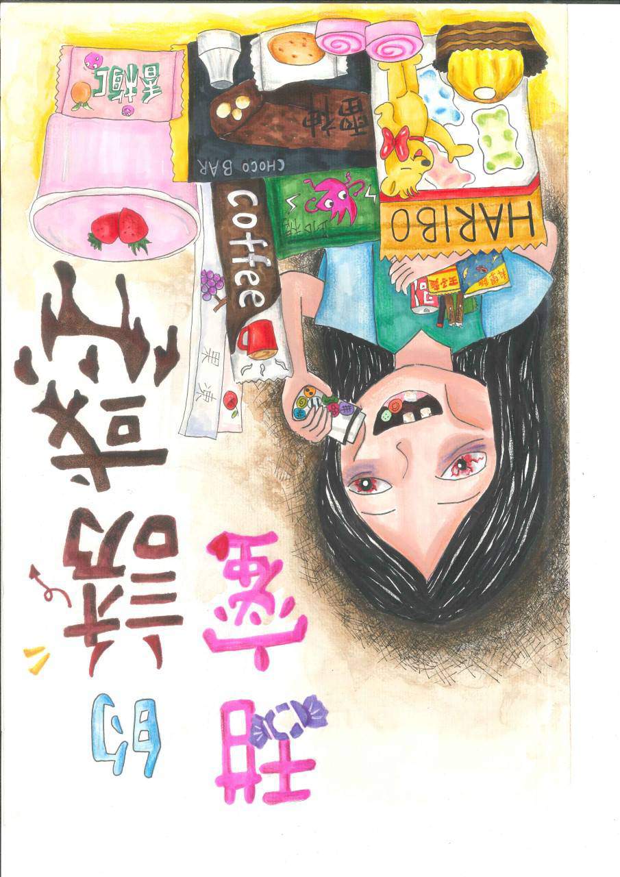 作品在描述一位充滿健康與朝氣的女孩遭受甜蜜外表的餅乾、糖果而誘惑。最可怕的誘惑就是”毒品”,吸食毒品會讓你無法自拔、成癮性甚至有自殺的傾向,希望藉由這幅畫讓大家知道毒品進而去制止它,它會以不同方式或外表出現在你面前,首先要知道毒品的可怕,學會拒毒、反毒的觀念,別讓一時的誘惑賠上了自己的寶貴生命,我們一起攜手向毒品說”NO”。