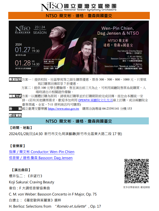 三、鼓勵學生進入音樂廳欣賞音樂會,特提供100元學生體驗票(可利用OPENTIX售票系統購買,入場時請出示相關證件備驗),同時提供校園購票享7折優惠;欣賞本音樂會可於音樂會現場申請公務人員終身學習時數認證。