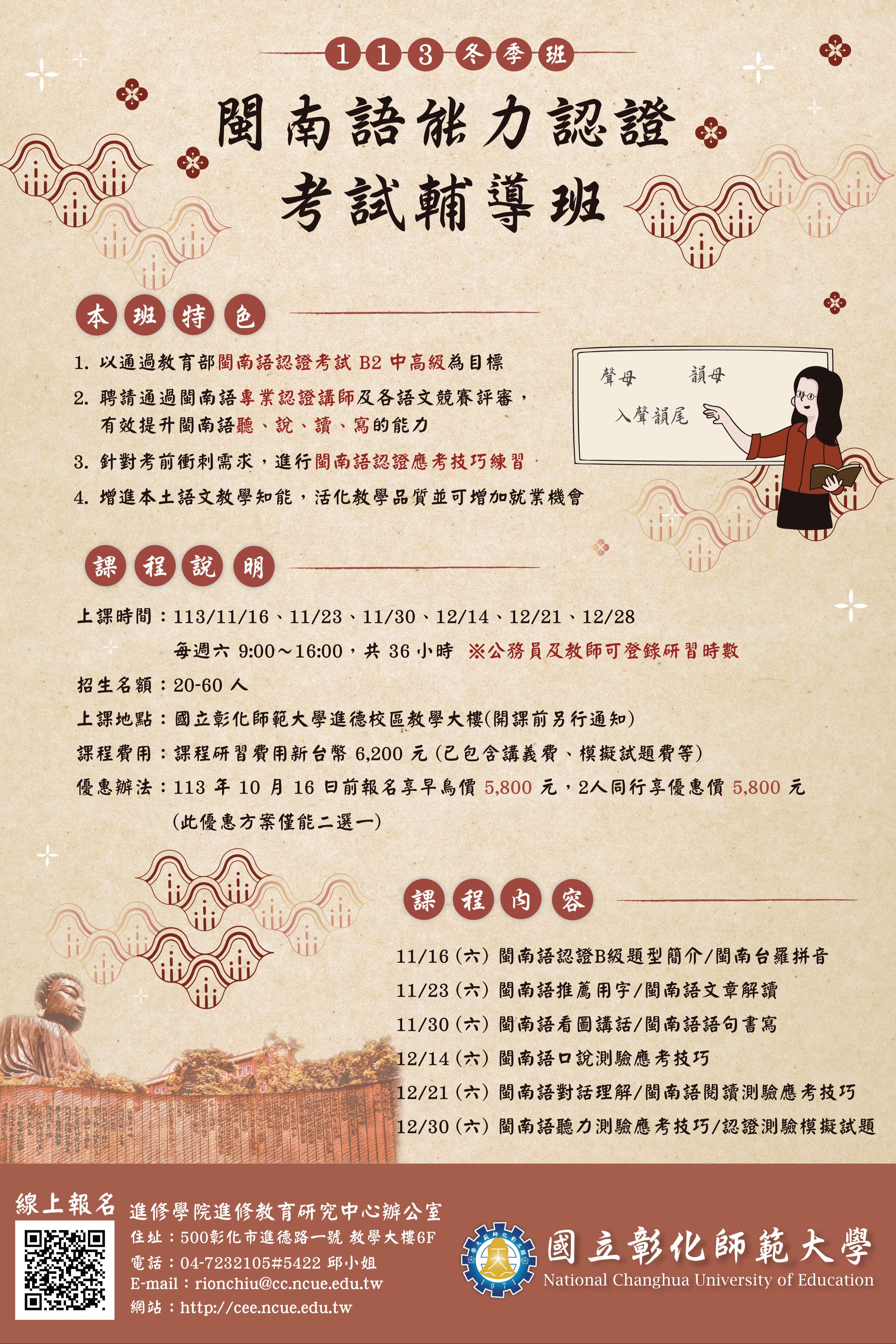 五、 | 如有相關問題,請向進修教育研究中心洽詢:(04)723-2105分機5422邱小姐,E-mail:rionchiu@cc.ncue.edu.tw。 |