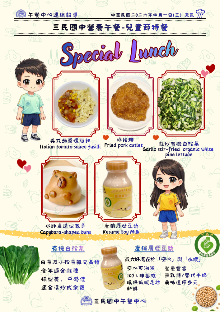 4/1本校午餐以兒童節特餐形式供應,話說18歲以下都能稱兒童,就用這美味的兒童節特餐同歡一下~