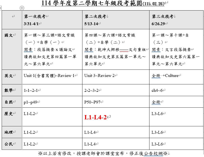 七年級歷史科段考範圍修正如下紅色標示處: (各任課老師同步於課堂宣布)